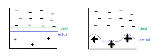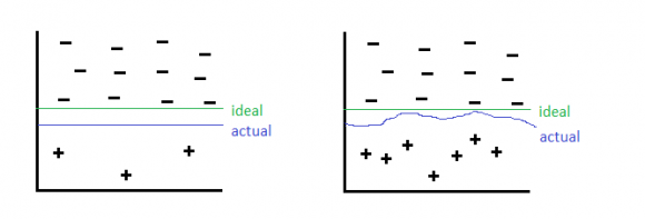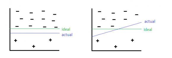 This looks a lot like linear regression, but we still need an objective function. This is where things get tricky. Based on the definition of \(\pm\)1 for classes, and the algebraic rules for inequalities, we can multiply by \(y_i\) and re-write this as a single line: