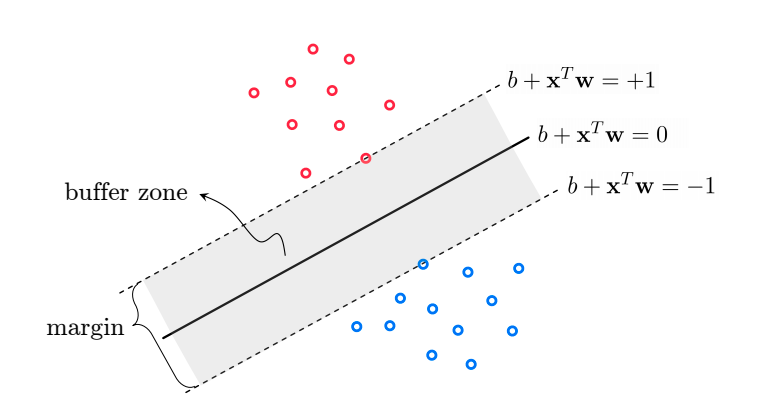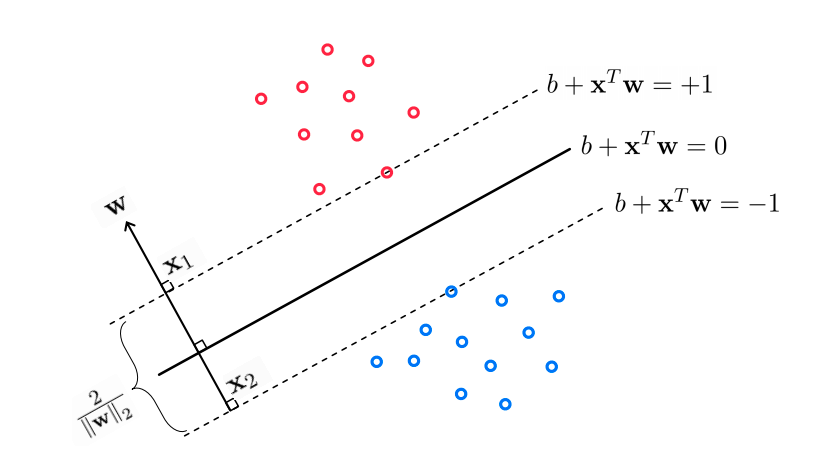 \(\bar{\bar{X}}\vec{w} < 0\) if \(y_i=-1\) (class 2)